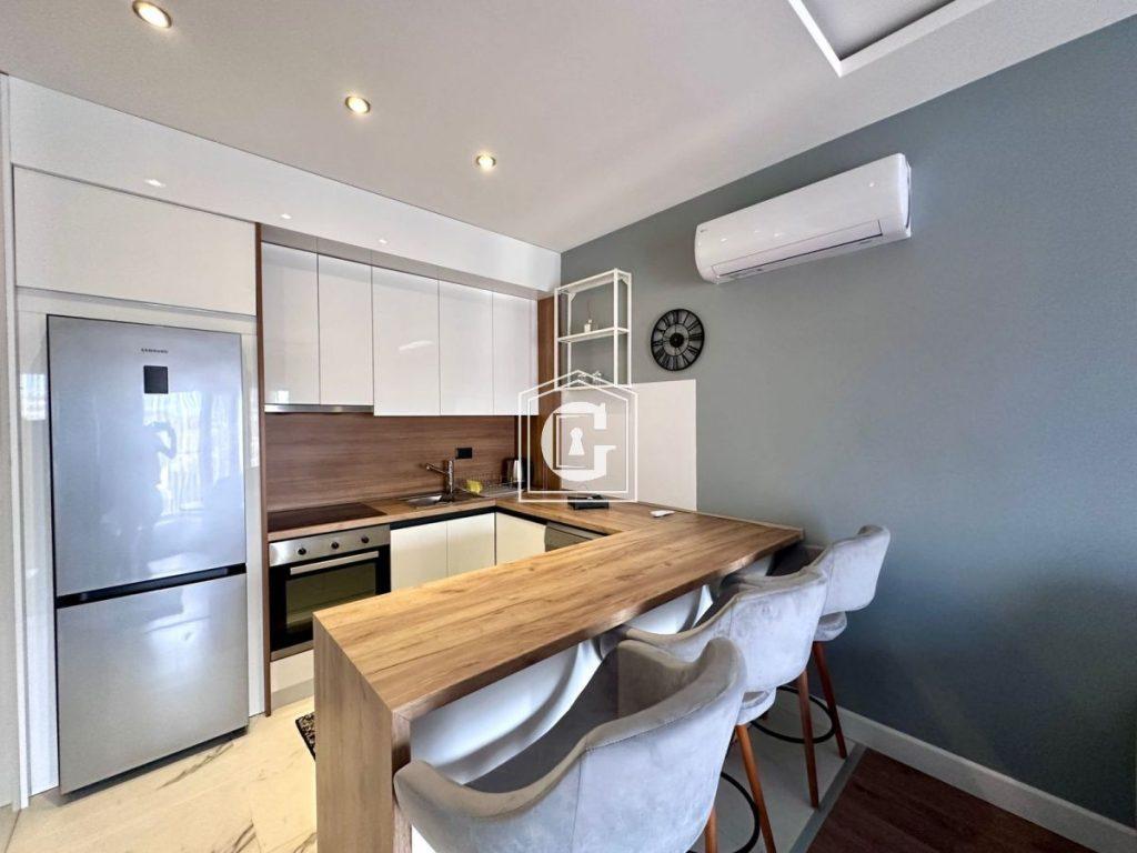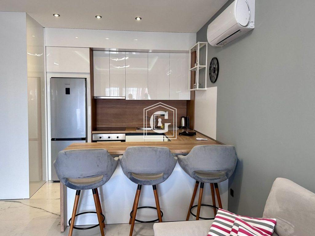 Apartment layout: kitchen-living room, 1 bedroom, 1 bathroom, terrace. New renovation with expensive and high-quality materials, stylish and modern interior, new high-quality furniture, new appliances, split-system air conditioning, water heater. SEA VIEW. New building in a developed resort location with all necessary infrastructure within walking distance.