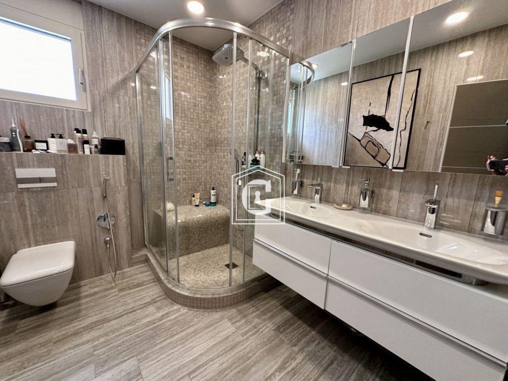 Villa layout: kitchen-living room, 5 bedrooms, 4 bathrooms, summer kitchen, study, walk-in closet, swimming pool, sauna, veranda with barbecue area. Modern and stylish interior with expensive furniture and appliances.