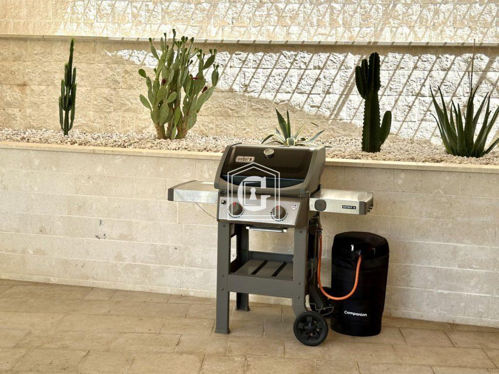 In the yard, there is a fruit garden and a veranda with a barbecue.