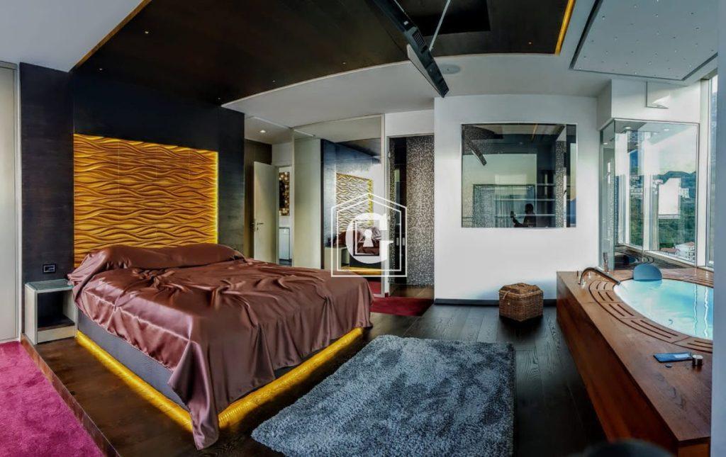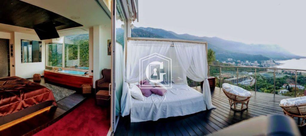“PREMIUM” class house. LARGE TERRACE WITH A POOL AND PANORAMIC VIEW OF THE SEA AND MOUNTAINS. Renovation using high-quality and expensive materials. Stylish and modern interior with new, harmoniously selected furniture and appliances. Ceramic tiles, plumbing. Split-system, electric water heater. Panoramic glazing. Bedroom with a bathroom and access to the terrace. Elevator. On the complex grounds: swimming pool, hammam, sauna, barbecue area/summer kitchen. Permanent on-site maintenance staff residing in the complex.