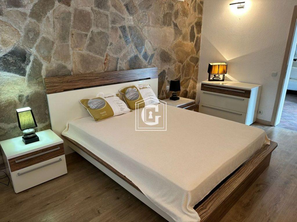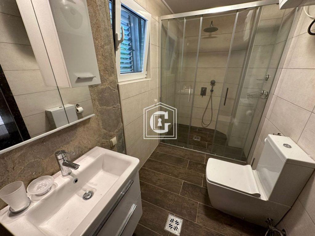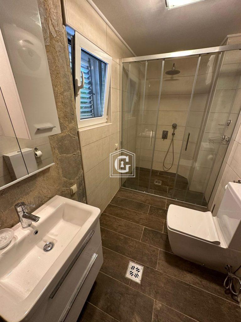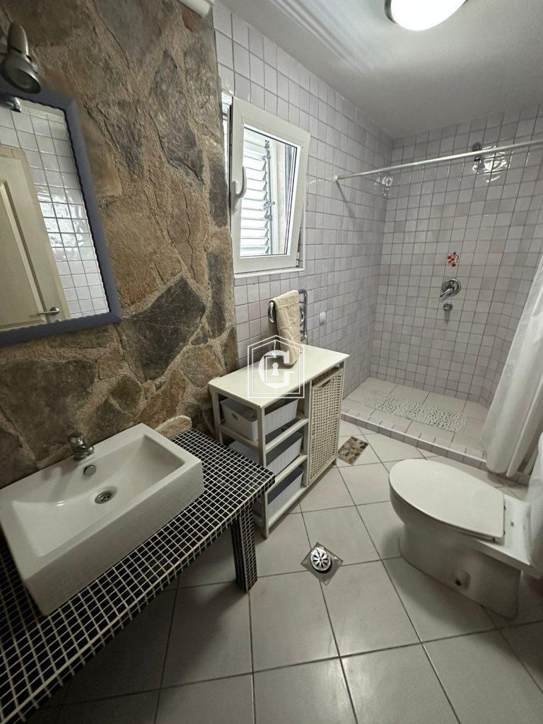 Apartment layout: kitchen-living room, 3 bedrooms, 2 bathrooms, 2 terraces. Large terrace with bay view and a large private terrace overlooking olive trees. Enclosed courtyard with trees, accessible from the bedrooms. Modern renovation, furniture, and appliances. Split systems, water heaters. Underfloor heating in bathrooms. Direct sea view. Garden with turtles on the property. Free parking by the house.