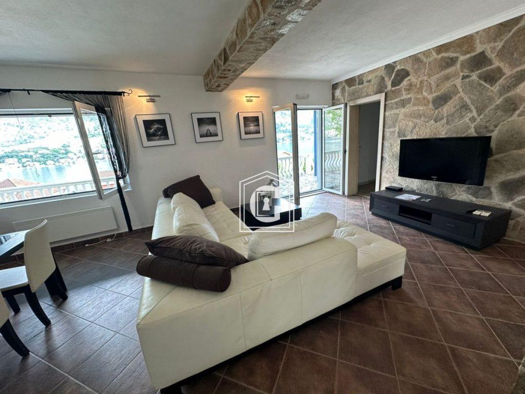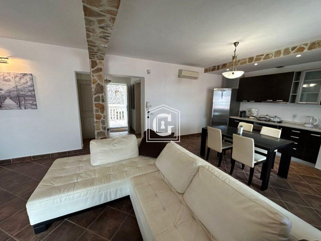 Apartment layout: kitchen-living room, 3 bedrooms, 2 bathrooms. Large terrace with bay view and a large private terrace overlooking olive trees. Modern renovation, furniture, and appliances. Split-system air conditioners, water heaters. Underfloor heating in bathrooms. Direct sea view. Garden with turtles on the property. Free parking by the house.