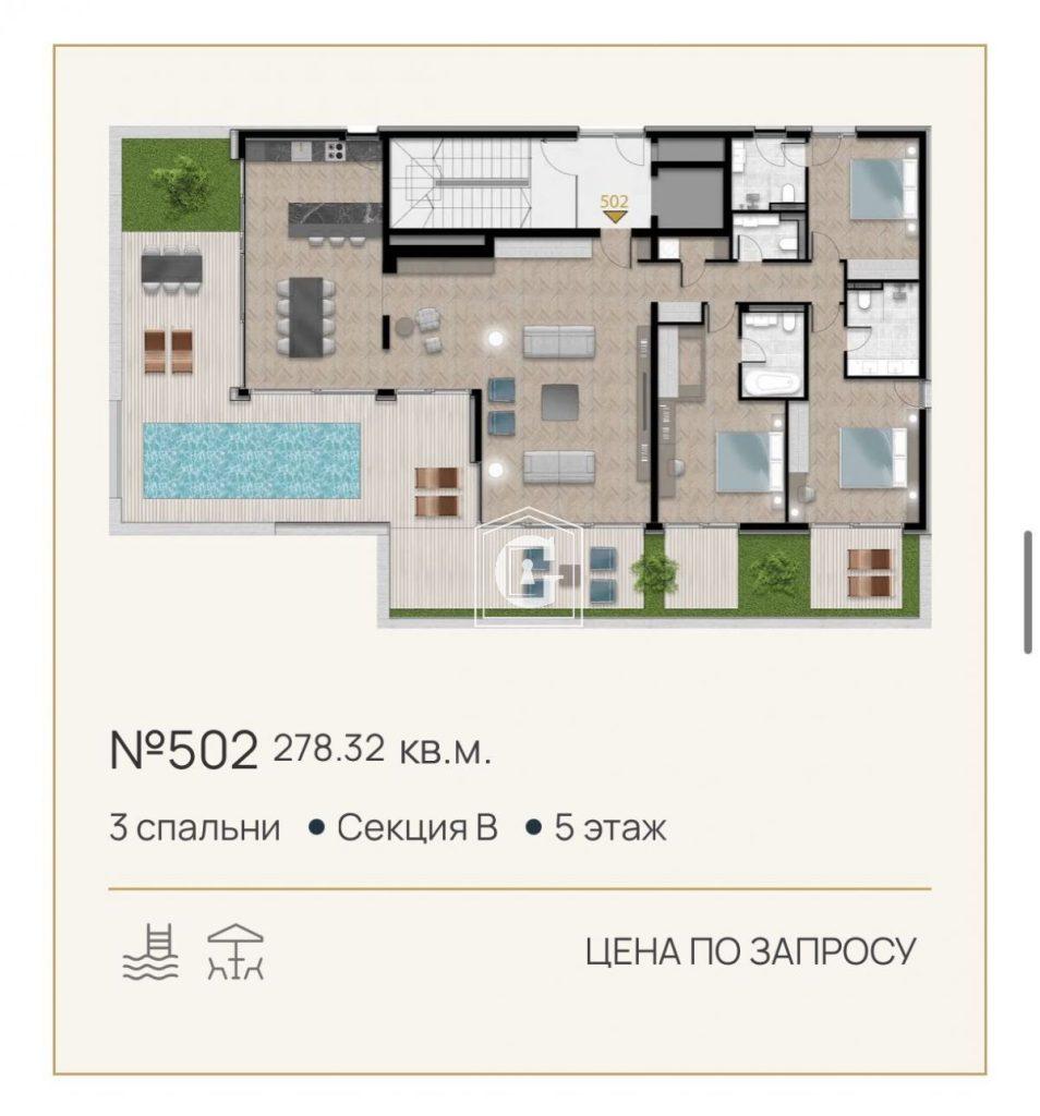 Studio Layout: Kitchen-living room; 3 bedrooms; 4 bathrooms, 2 terraces (One large terrace with a pool).