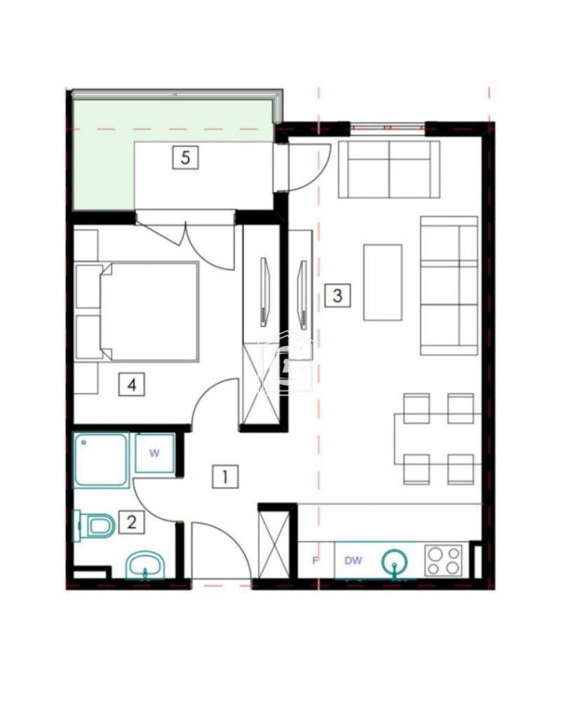 Apartment layout: Kitchen-living room, 1 bedroom, bathroom, terrace.