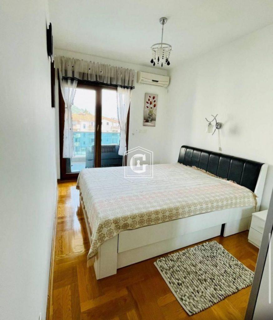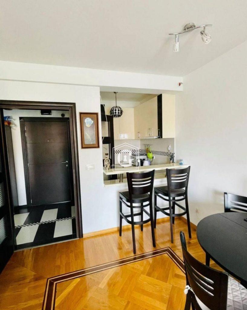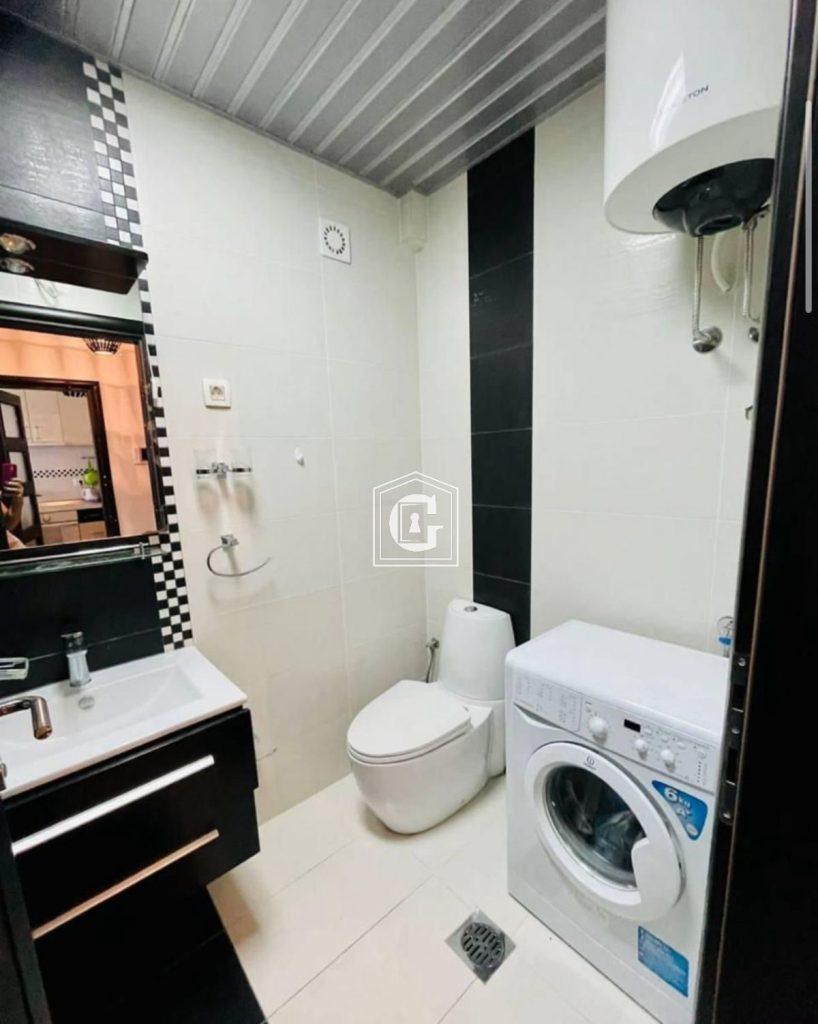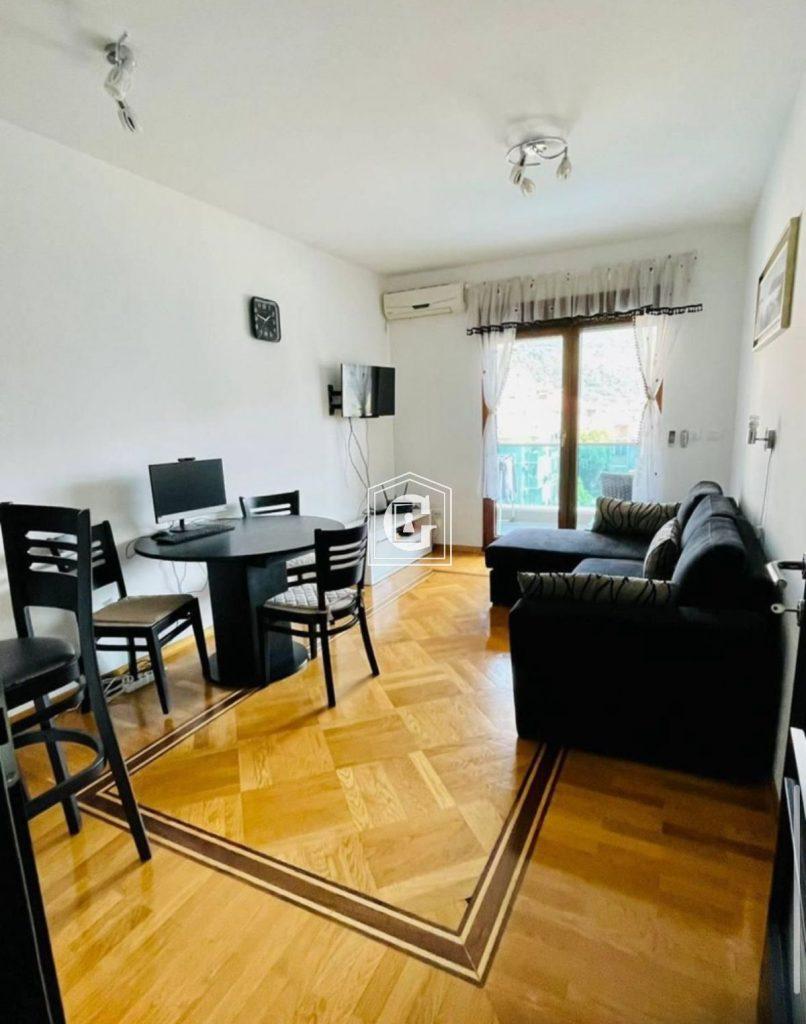 Apartment layout: 1 bedroom, 1 bathroom, kitchen-living room, terrace with tribal furniture.