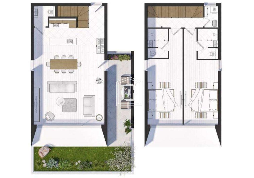 Apartment layout: (Duplex) Kitchen-living room, 2 bedrooms, 3 bathrooms, huge two-sided terrace, storage room.