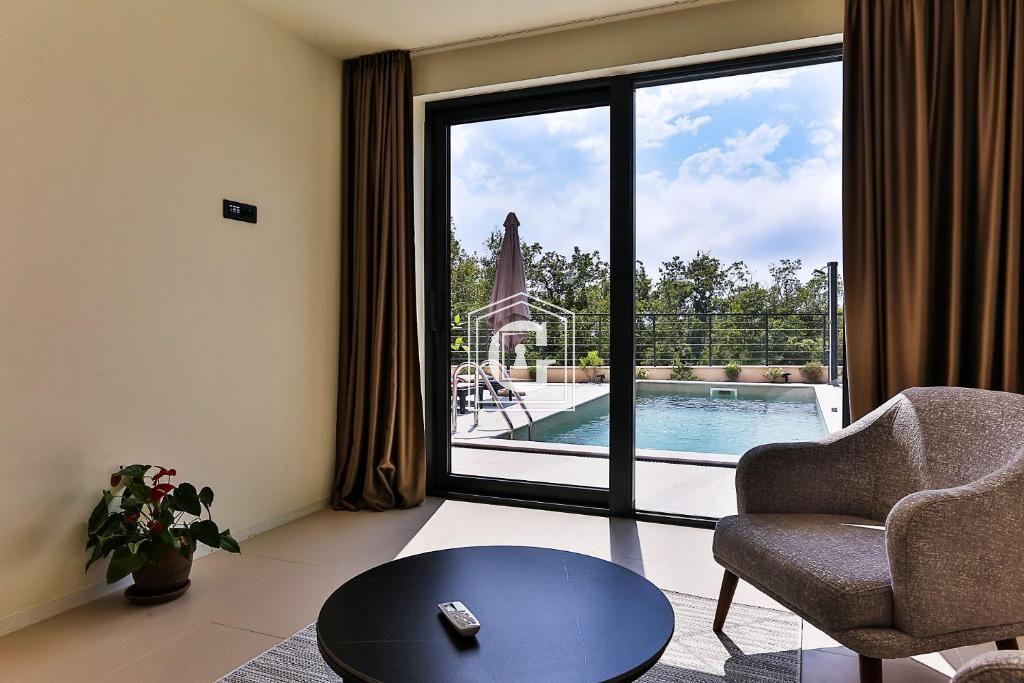 • Lower floor (-1) living room with armchairs, opening directly onto the pool terrace