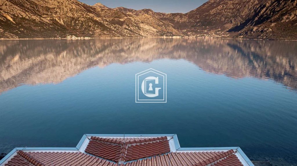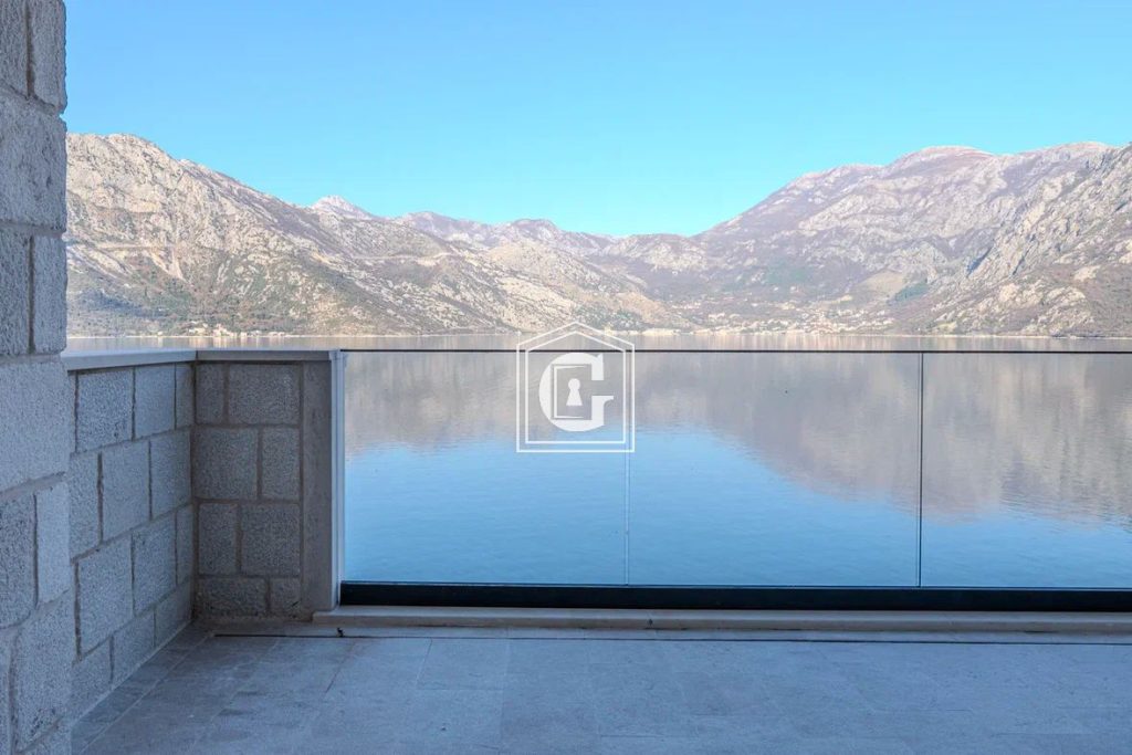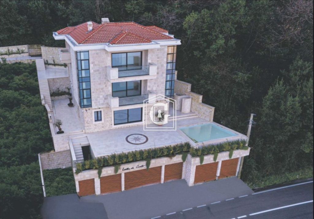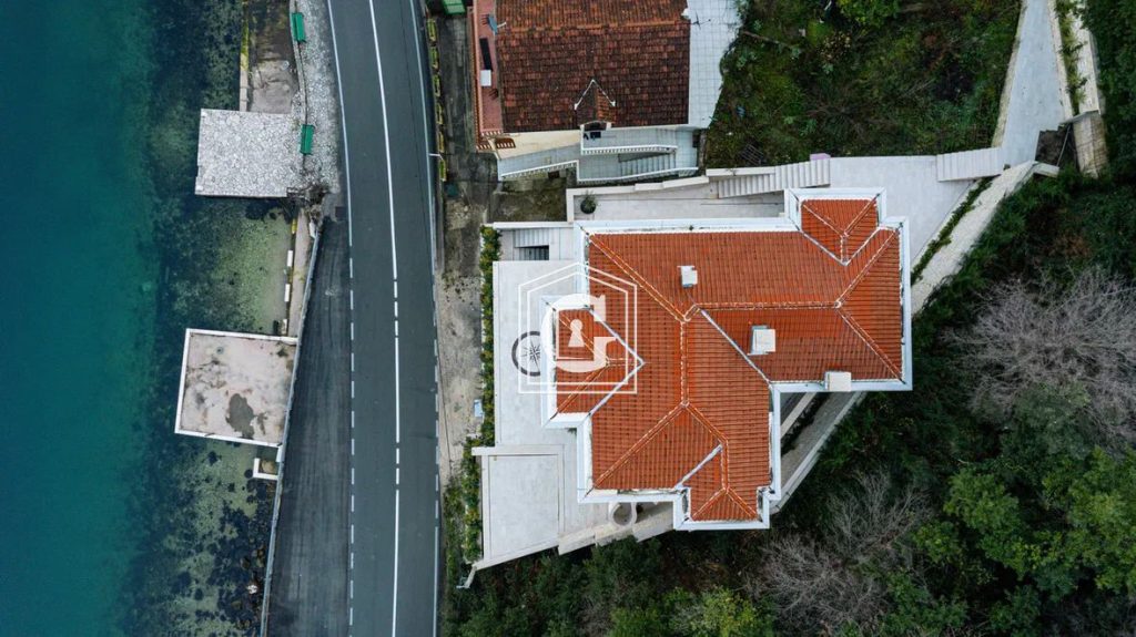 Panoramic view of the Bay of Kotor. Swimming pool. Modern stonework, a combination of traditional materials and high exclusivity of the interior. Expensive and high-quality tiles, plumbing, panoramic glazing. Split-system, boilers. There is private access to the seashore, where a small sandy beach is located, as well as a 100 m2 pier with water, sewage, and electricity, a shower cabin, a toilet, and two yacht berths. The dock has its own all-weather canopy.