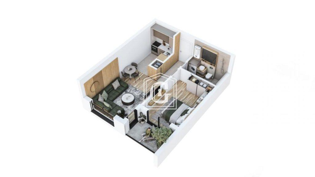 Структура квартиры: Кухня-гостиная, 1 спальня, 1 санузел, прихожая, терраса.
