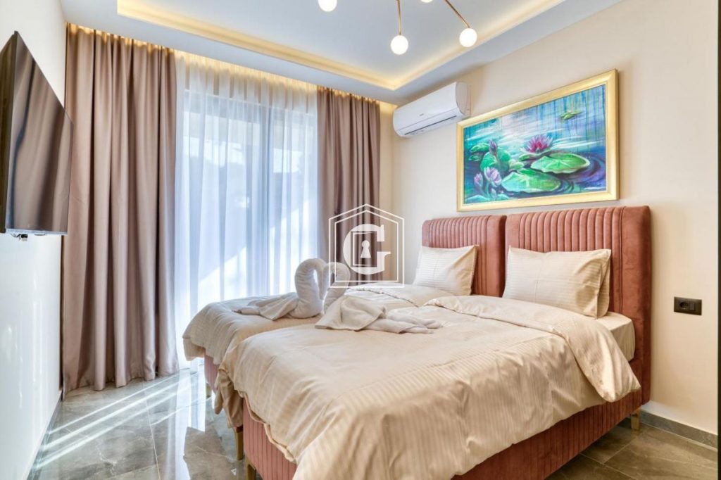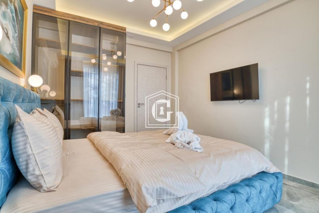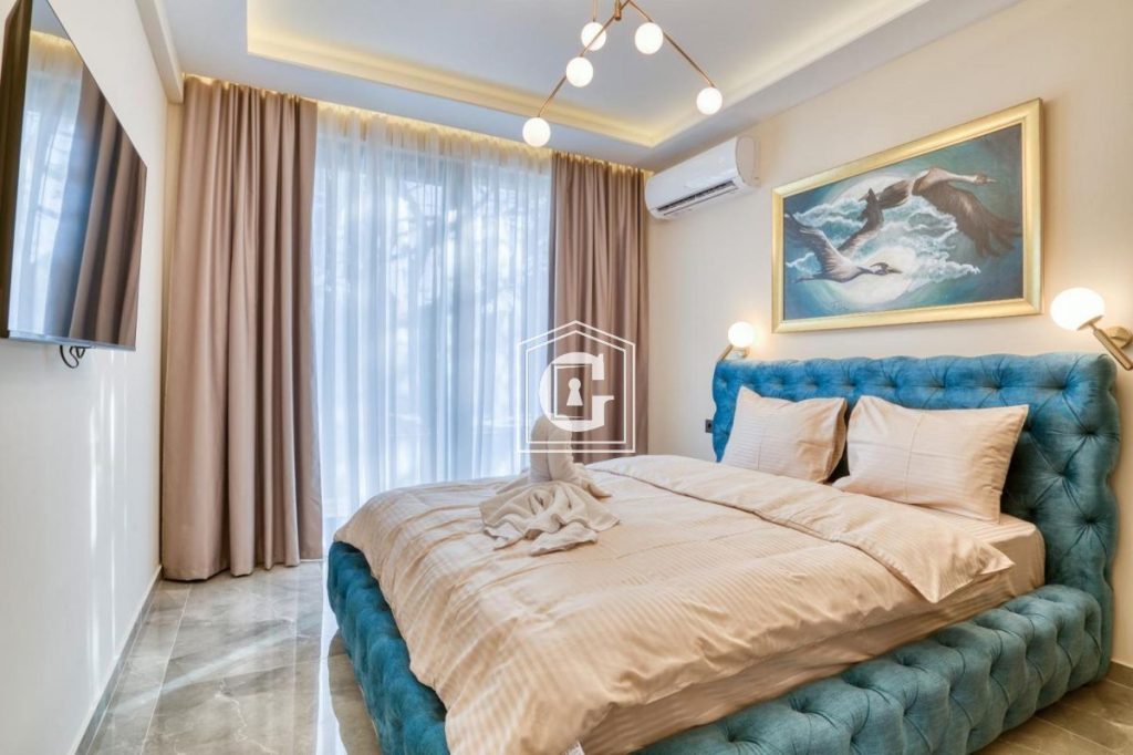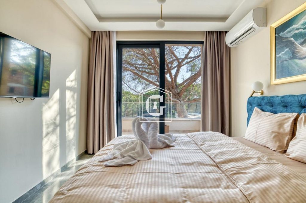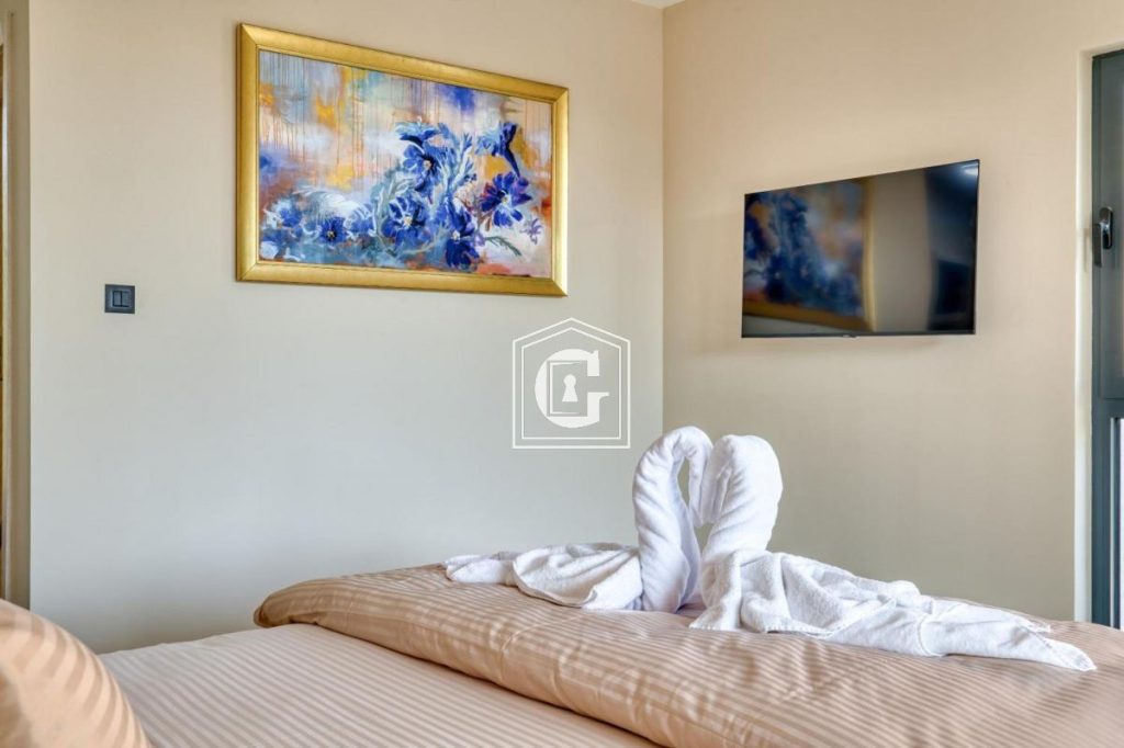 The drive to the airport takes approximately 27 minutes. A private pool is located on the balcony, and beach sun loungers are available for guests’ comfort.