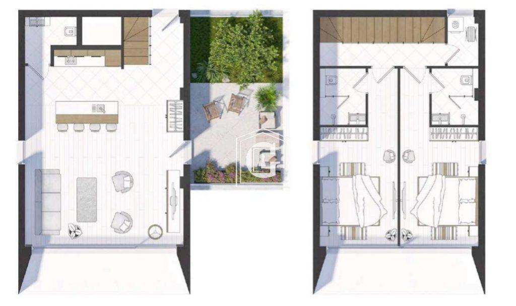 Struktura stana: (Duplex) Kuhinja-dnevni boravak, 2 spavaće sobe, 3 kupatila, velika terasa, ostava.