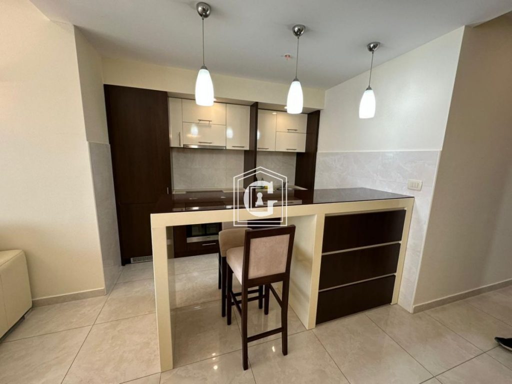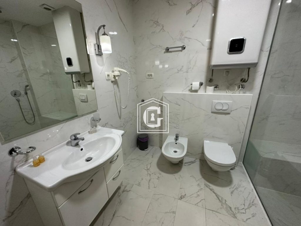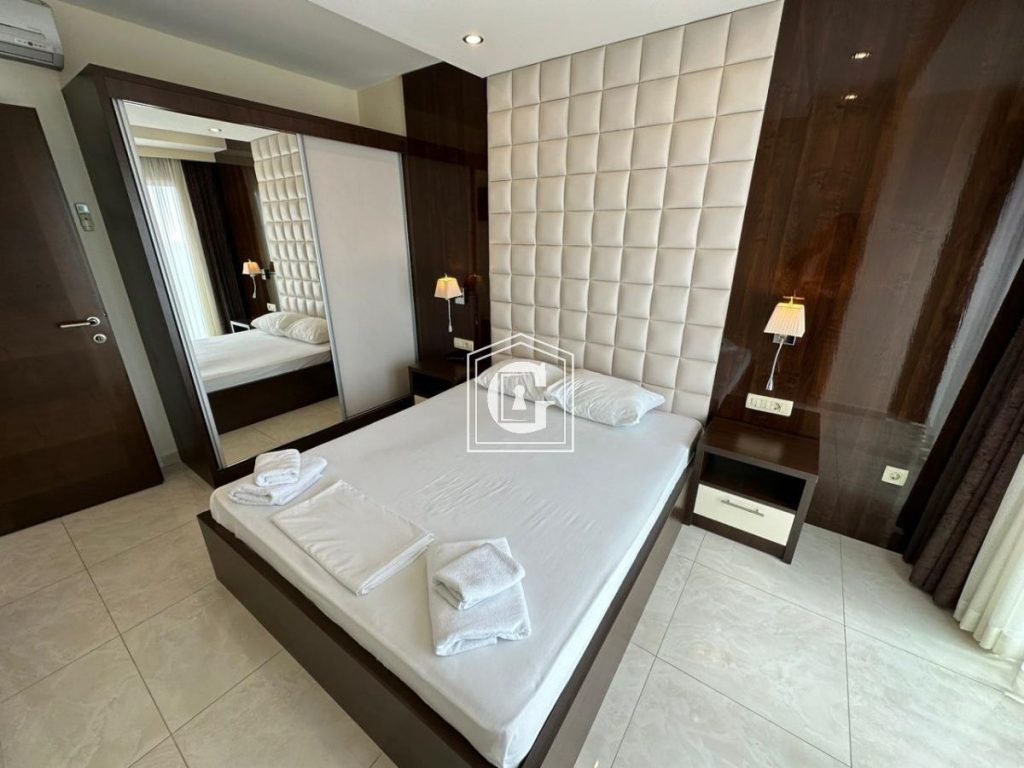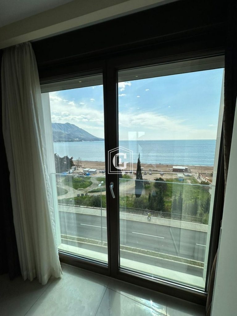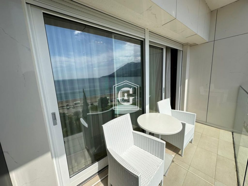 Struktura stana: 1 spavaća soba, 1 kupatilo, kuhinja-dnevni boravak, terasa sa direktnim pogledom na more. 5. sprat. Panoramaski prozori. Pogled na more i planine. Novi renovirani stan, nameštaj, tehnika. Podno grejanje u celom stanu. Parking mesto u podzemnom garažnom prostoru uključeno u cenu. Klima uredjaj, bojler, električne roletne.