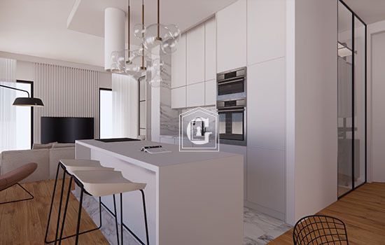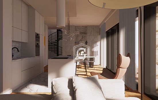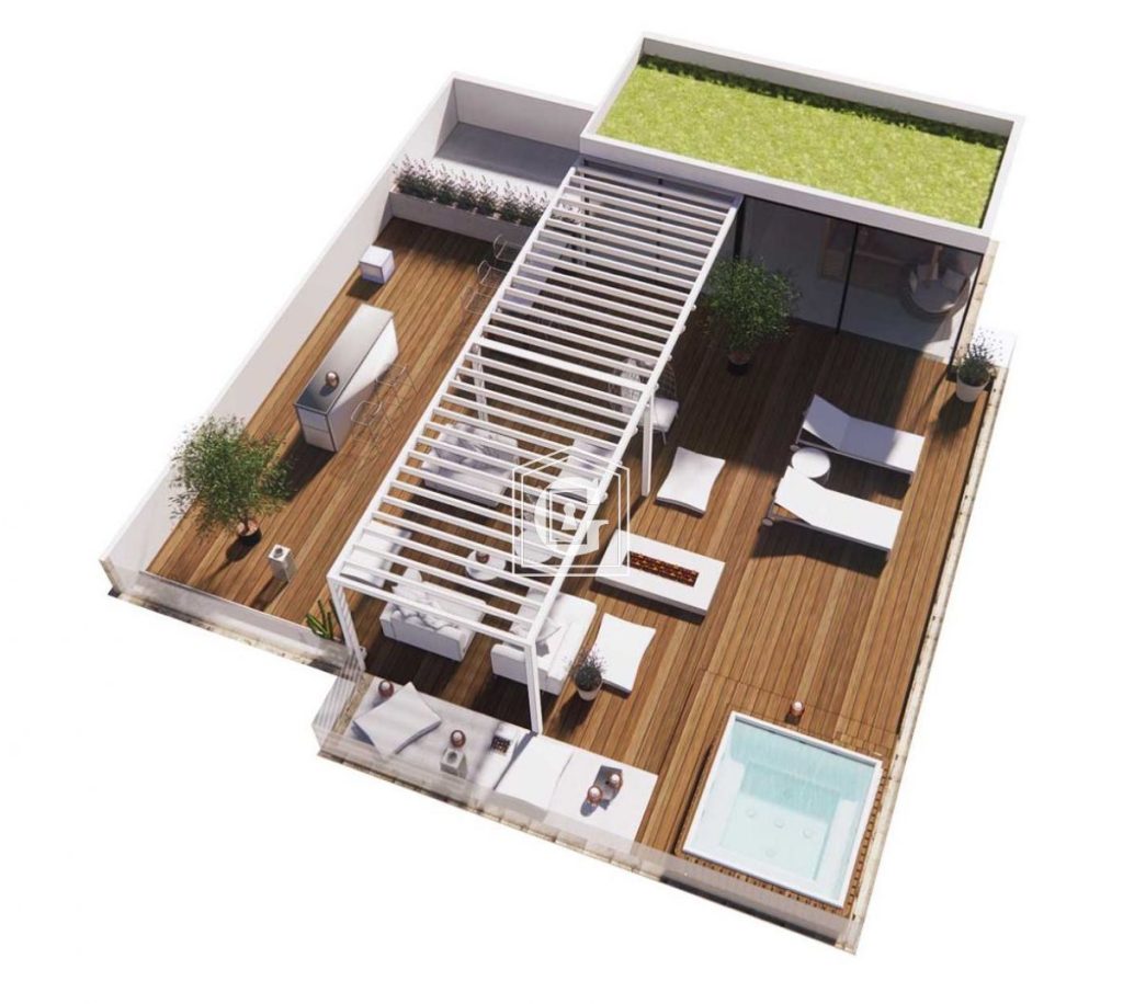 Struktura stana: Penthouse. 2 sprata + izlaz na krov. Kuhinja-dnevni boravak, 3 spavaće sobe, 2 kupatila, terase na svakom spratu, predsoblje.
