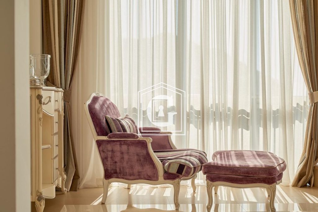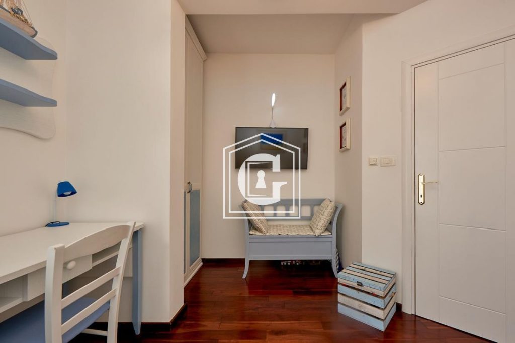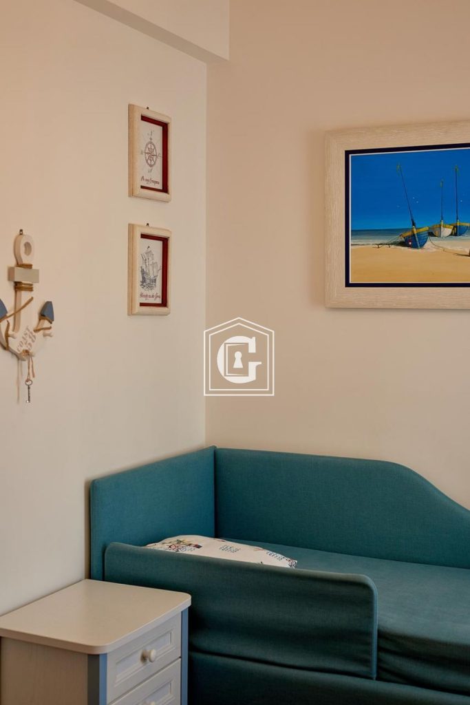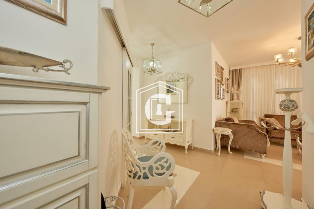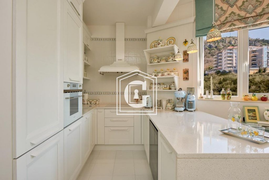 Novi stambeni kompleks sa zatvorenim prostorom. Jedna od spavaćih soba je uređena kao dečija soba. Kauč u dečijoj sobi se rasklapa na 2 odvojena ležaja. Pogled iz prozora u sobama na more i planine. Visina plafona 2.70 m. 2 terase sa pogledom na more. Kuhinja-blagovaonica je opremljena ugrađenom tehnikom: frižider Miele, mašina za pranje posuđa Smeg, šporet Gorenje, napa Smeg, ugrađena rerna sa funkcijom mikrotalasne pećnice Smeg, frižider za vino Smeg. U gostinskom kupatilu/ostav-veš mašina postavljena je mašina za pranje veša/mašina za sušenje veša Miele, opremljen je ormar za skladištenje kućnog inventara i hemije. Dva kupatila su opremljena tuš kabinama (master spavaće sobe), jedno kupatilo je opremljeno kadom. U svakom kupatilu su instalirani bojleri, električni sušaci za peškire. U svakoj sobi se nalaze televizori (5 komada) Samsung. Prodaje se nameštajem, svetiljkama, belom tehnikom, zavjesama i slikama. Nameštaj, lusteri, svetiljke najvišeg kvaliteta proizvedeni u Italiji. Stan se nalazi u zgradi na poslednjem 5. spratu. Jedan stan po spratu. Hodnik ispred ulaznih vrata je opremljen nameštajem za čuvanje obuće i stalkom za vešalice, što omogućava smeštaj obuće i gornje odeće.