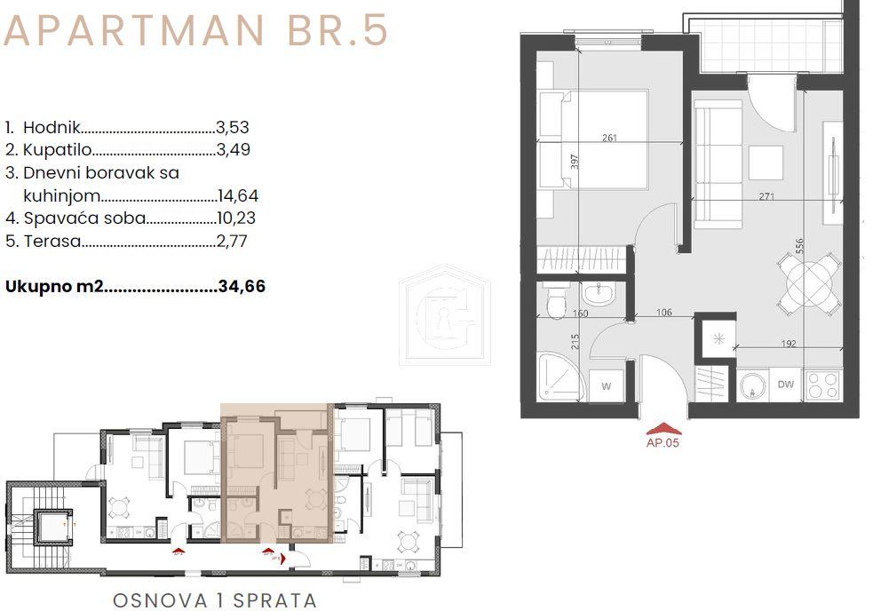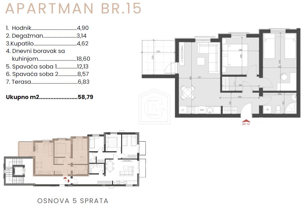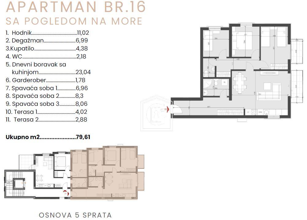 Struktura zgrade: 19 stanova različitih tipova, jednosobni, dvoiposobni i troiposobni, površine od 34 do 79m2.