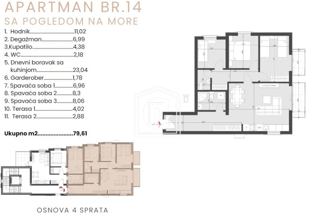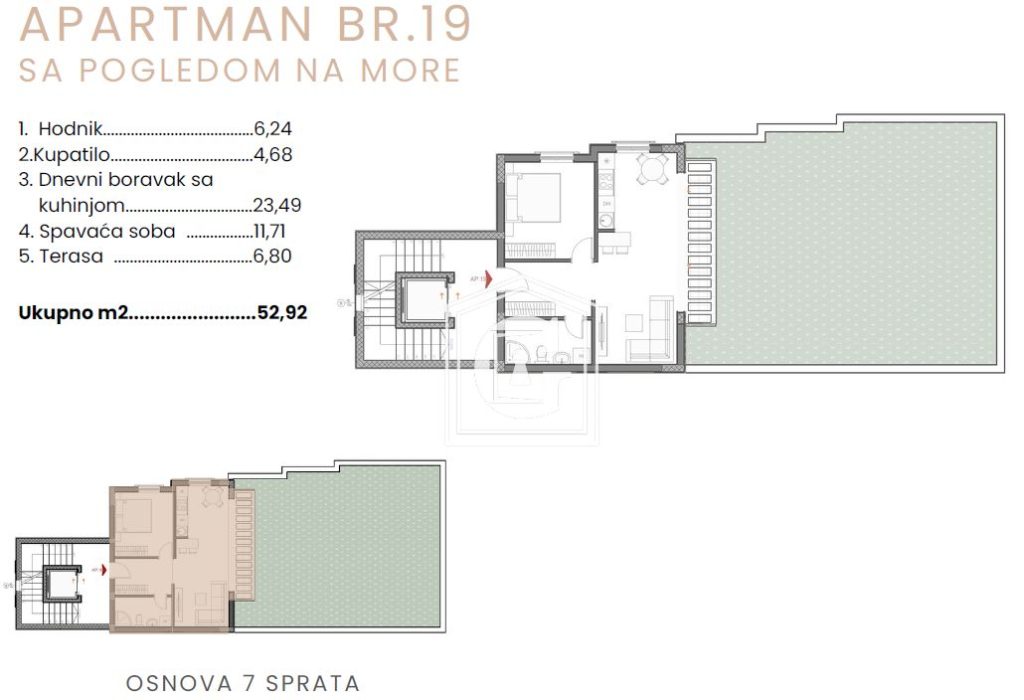 Struktura zgrade: 19 stanova različitih tipova, jednosobni, dvosobni i trosobni, površine od 34 do 79m2.